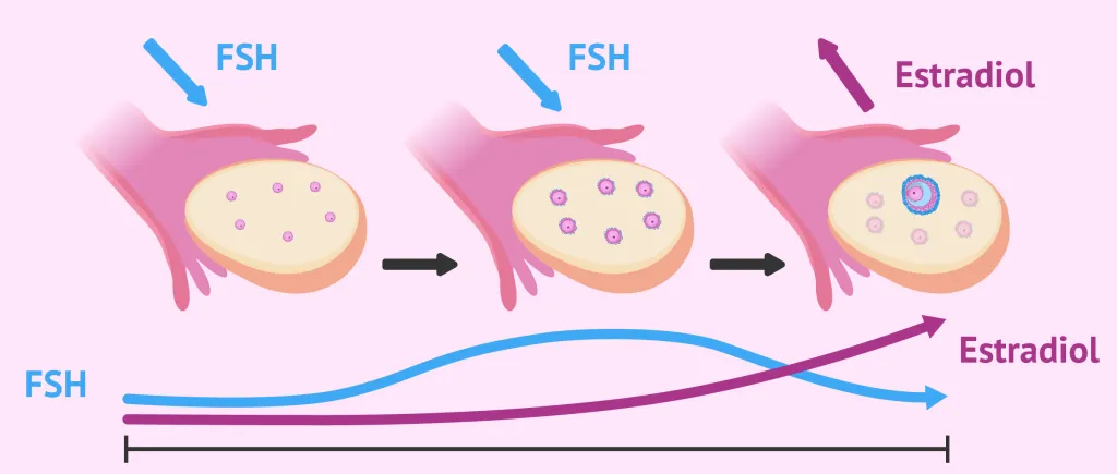 在周期开始时,FSH开始从大脑分泌并作用于卵巢。为了响应这种FSH 激增,含有未成熟卵母细胞的原始卵泡开始生长并迁移到卵巢表面。