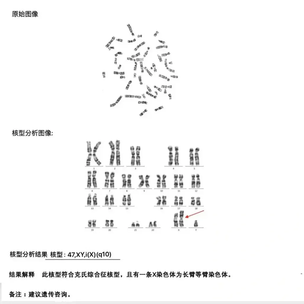 客户,男性,45岁,因多年不育来咨询帮助。该客户进行生殖健康检查后,精液常规分析结果提示为无精症。为了进一步明确无精症的原因,我们建议他做外周血染色体核型分析检查,结果显示染色体核型为47,XY,i(X)(q10),即多了一条长臂等臂X染色体,这是染色体数目异常的核型。